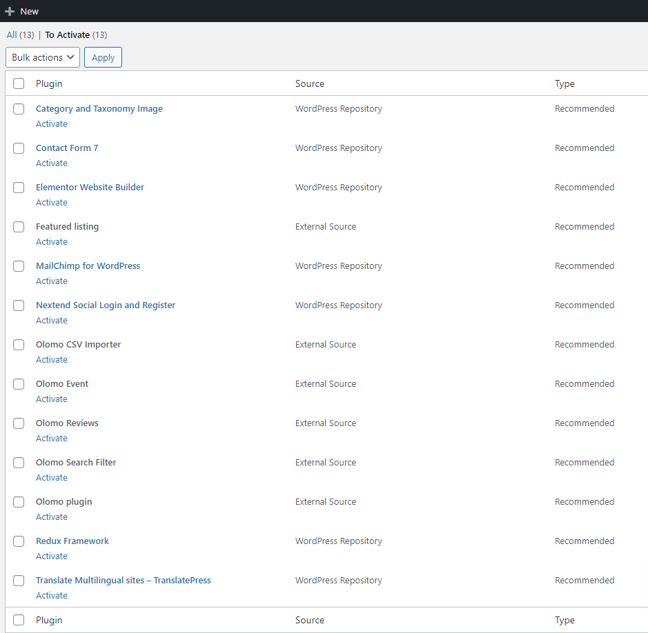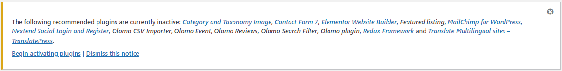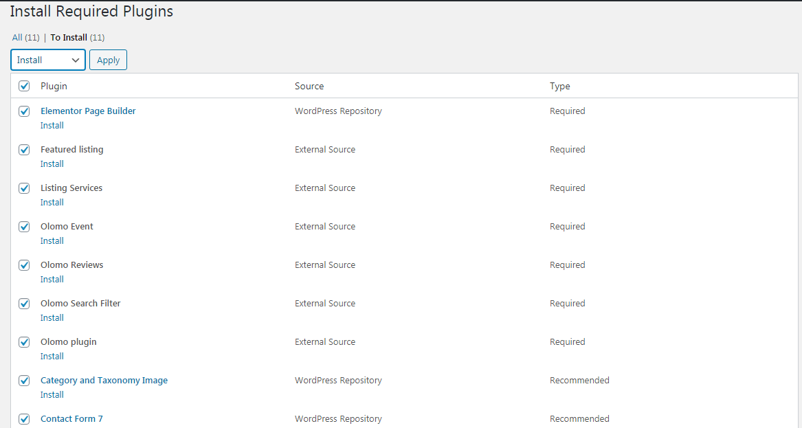 After installation, you will be suggested to install additional plugins. To install them and activate, please navigate to Plugins, you will see a list of required and optional plugins. We recommend that you install the following to get the best of our theme: