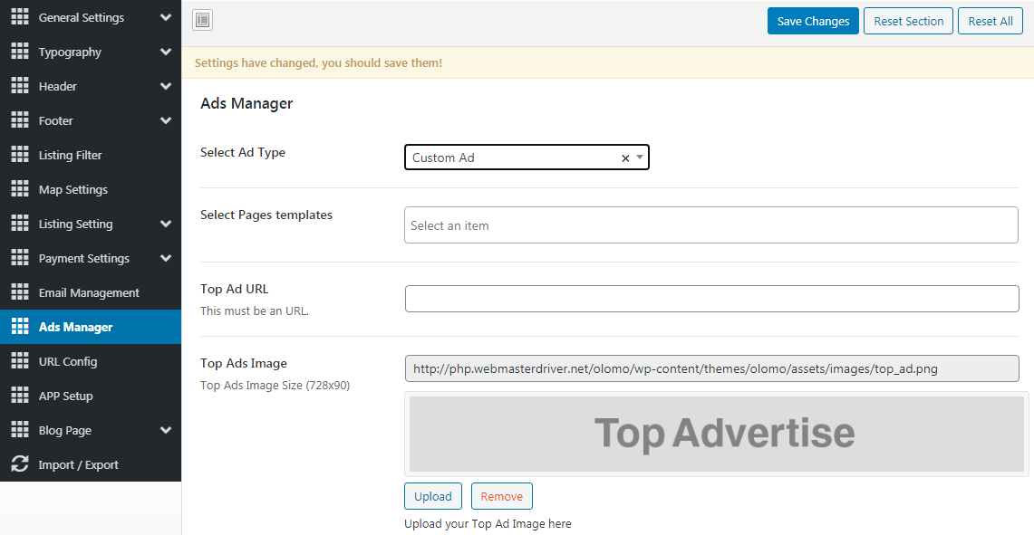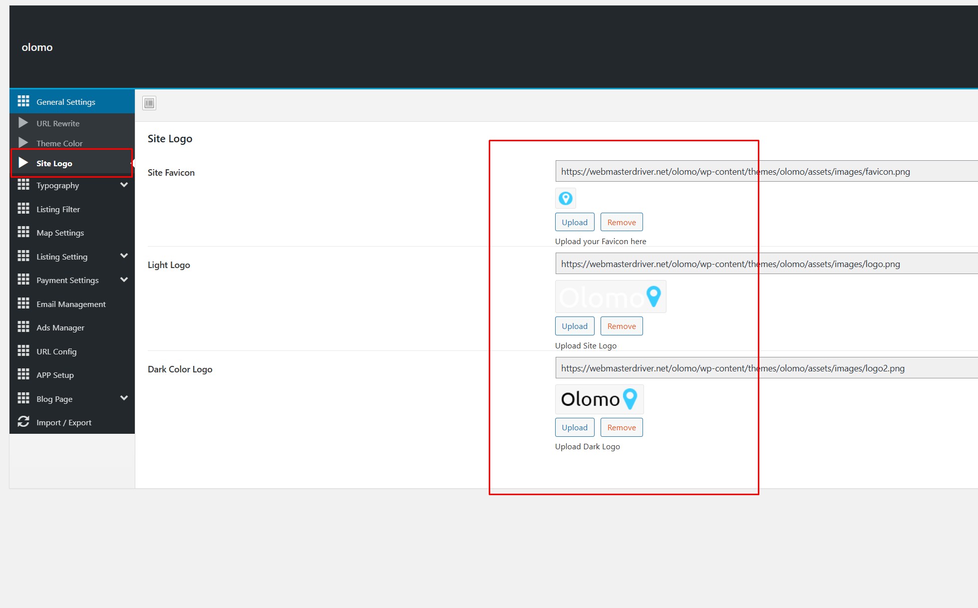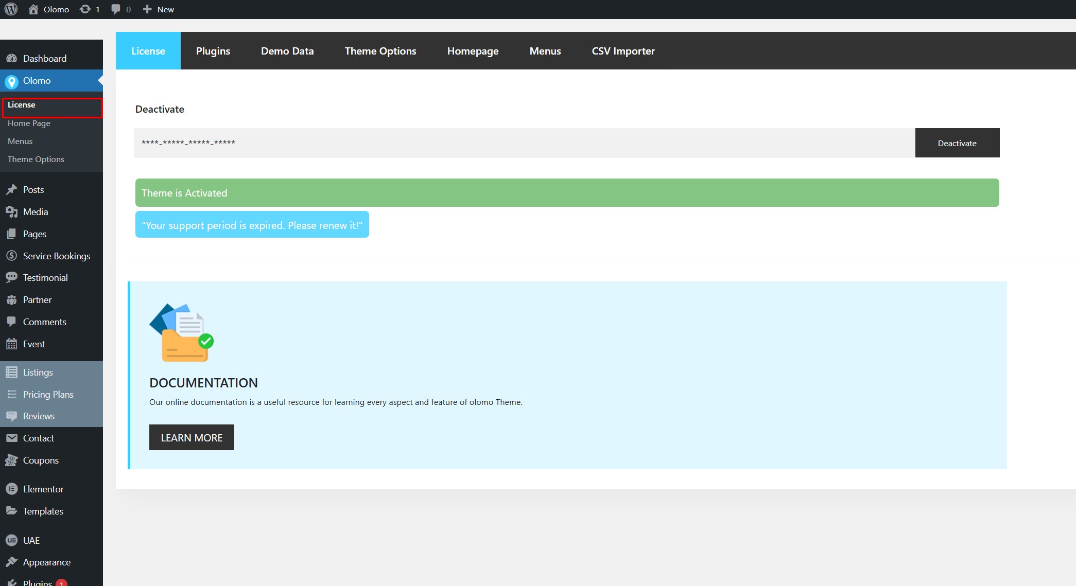 Once you install and activate the theme: you will see Olomo Tab below Dashboard tab in backend.