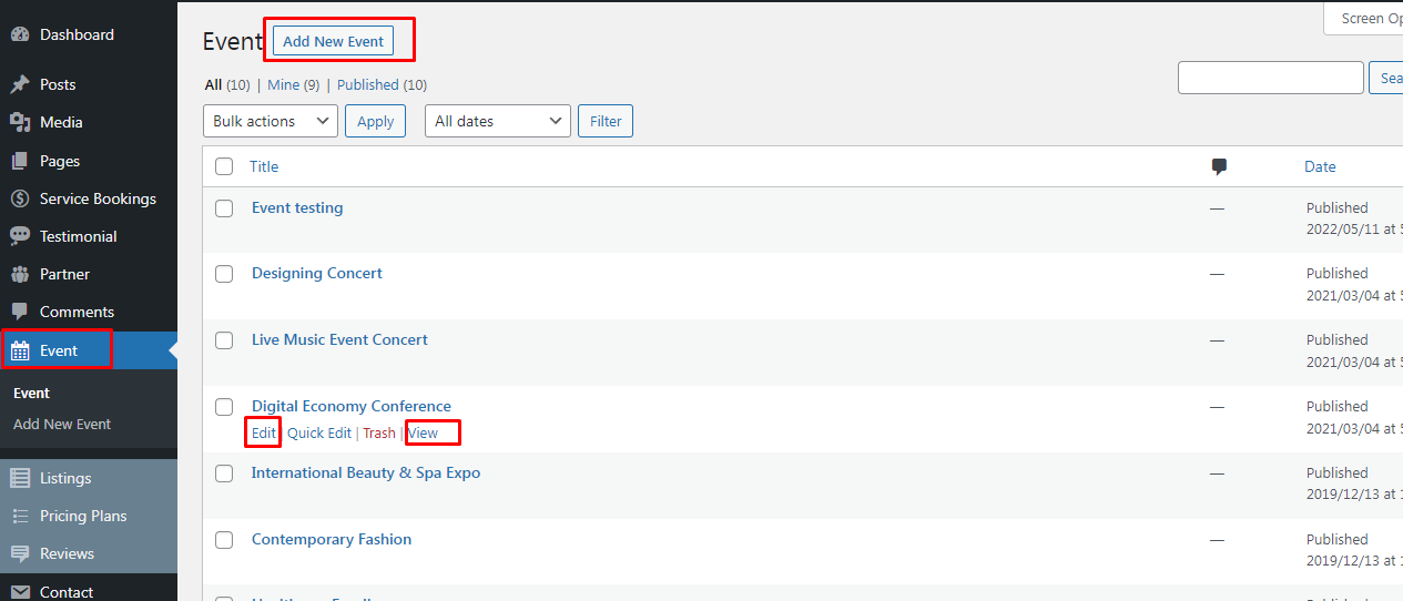 Then you just simply go to Wordrpress ADMIN Dashboard and go to left side "Event" option.