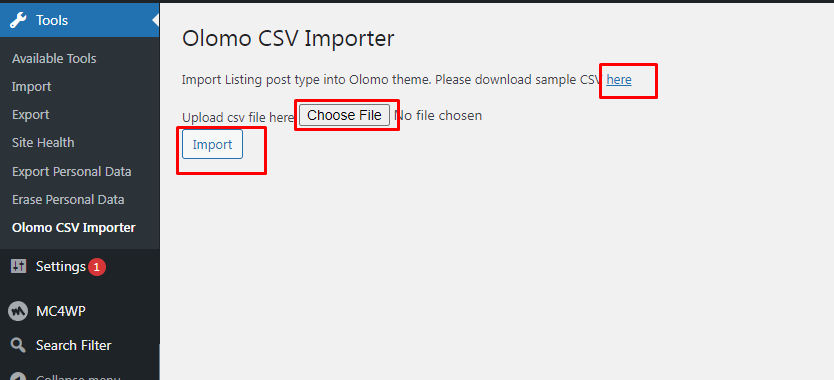 Then you just simply go to Wordrpress ADMIN Dashboard and go to left side Tools --> "Olomo CSV Importer" option.