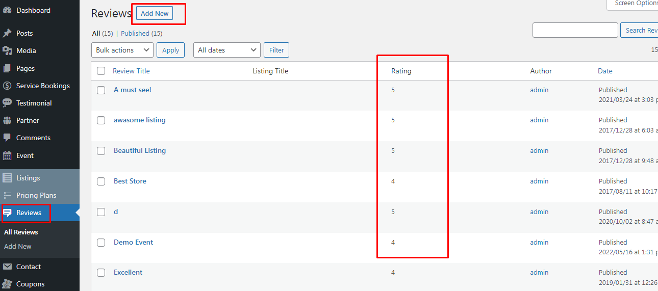 Please open the "Reviews" option and from here you can view all the Reviews which is created for Listings. ADMIN can approve/publish or delete those reviews. Please check the screenshot here: