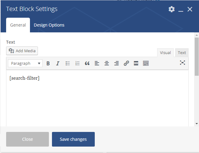 2.1. Add Text Block in Page Editor after then Paste This Shortcode Code:- [search-filter]