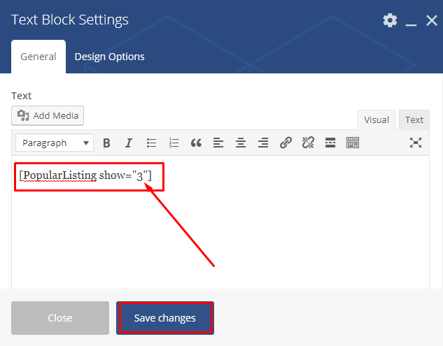 6.1. Add Text Block in Page Editer after then Paste This Shortcode Code:- [PopularListing show="3"]