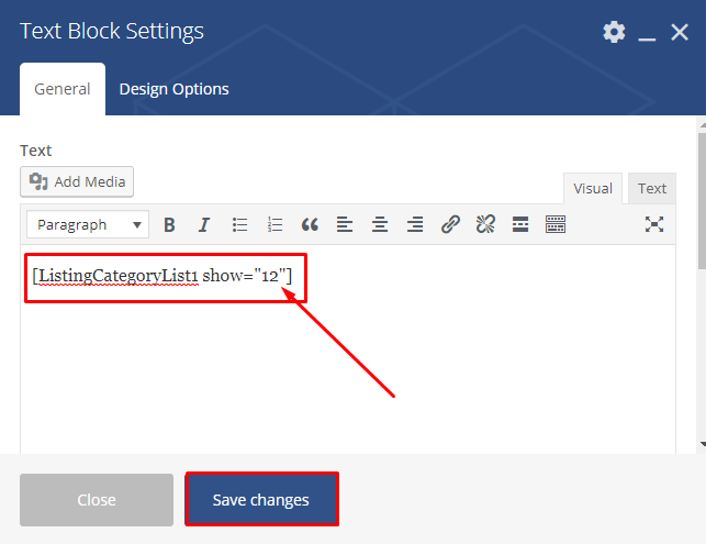 3.1. Add Text Block in Page Editer after then Paste This Shortcode Code:- [ListingCategoryList1 show="12"]