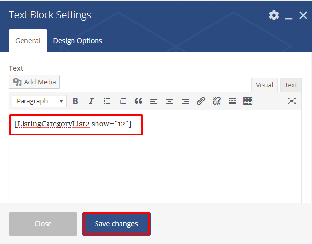 4.1. Add Text Block in Page Editer after then Paste This Shortcode Code:- [ListingCategoryList2 show="12"]
