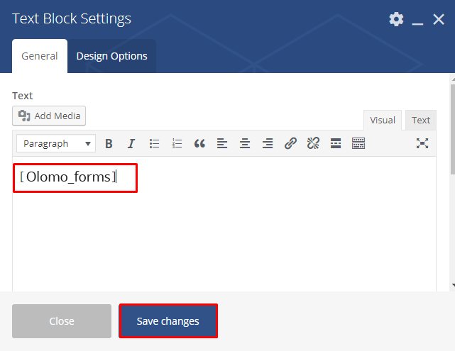 1.1. Add Text Block in Page Editer after then Paste This Shortcode Code:- [Olomo_forms]